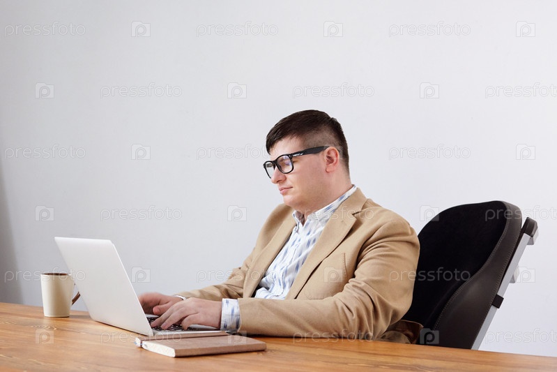 Современный бизнесмен сидит в инвалидной коляске перед ноутбуком