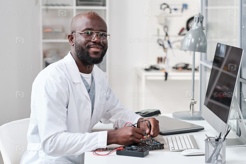 Молодой веселый мастер по ремонту или лабораторный работник в белом халате подробности сварки печатных плат