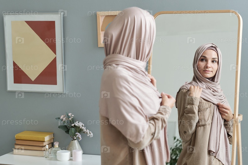 Молодая мусульманка в хиджабе смотрит в зеркало
