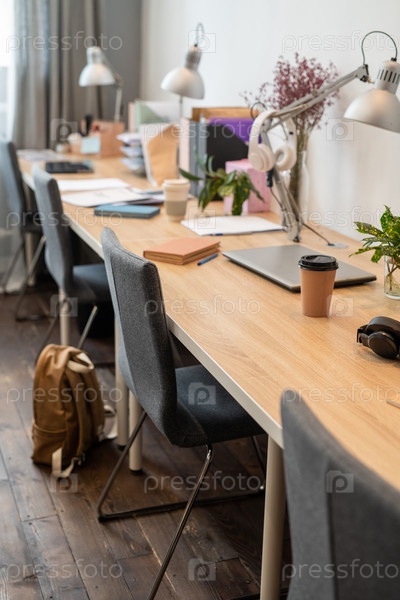 Длинный деревянный стол с лампами и стульями, стоящими вдоль стены