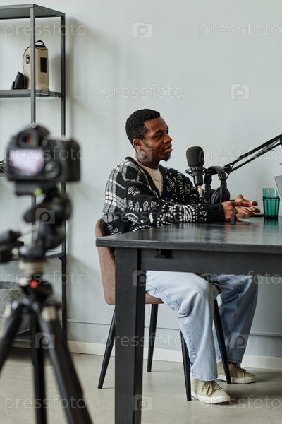 Мужчина записывает видео подкаст Черный