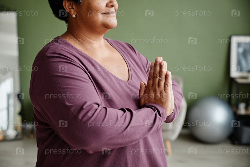 Чёрная старшая женщина медитирует дома вблизи