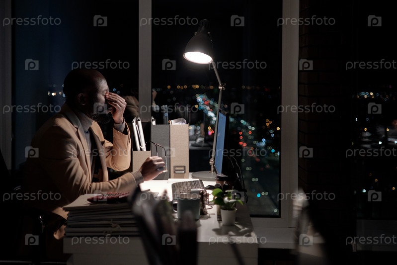 Молодой измученный бизнесмен пытается сконцентрироваться, работая поздно ночью