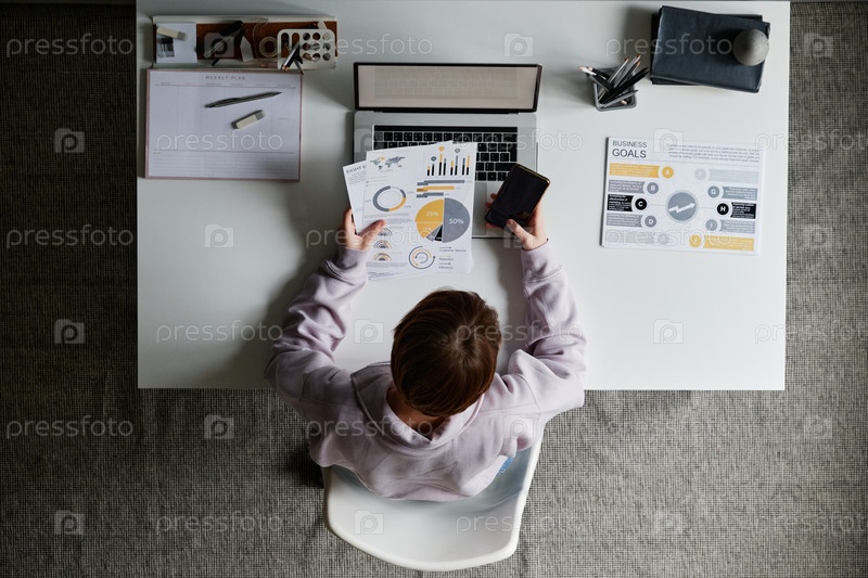 Вид сверху короткошерстной женщины в свитерке, сидящей за столом и держащей бумаги во время отправки сообщений по телефону на рабочем месте