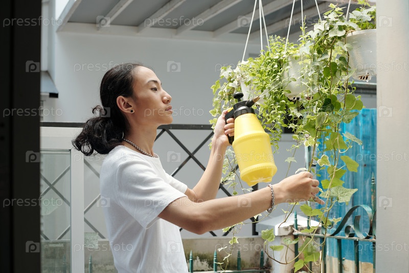 Разбрызгивание растений плюща Человек