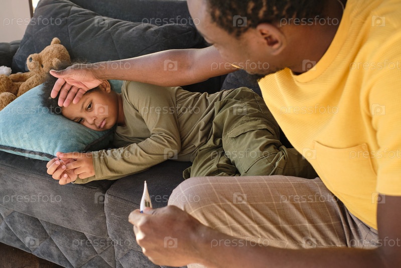 Юный отец прикасается к голове своего больного маленького сына