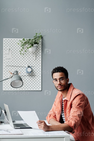 Портрет серьезного молодого чернокожего бизнес-специалиста в обычной рубашке, сидящего в офисе с серой стеной и анализирующего бумагу