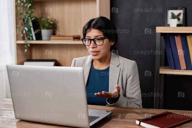 Уверенная молодая учительница испанского языка в куртке сидит за столом в офисе и использует ноутбук, разговаривая со студентом через приложение видеоконференцсвязи