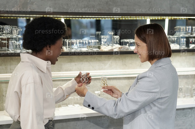 Счастливая молодая помощница магазина консультирует африканскую женщину-потребительницу
