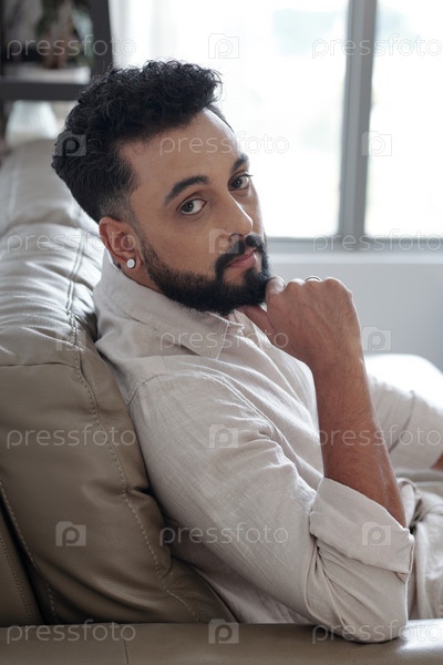 Серьезный бородатый мужчина сидит на диване