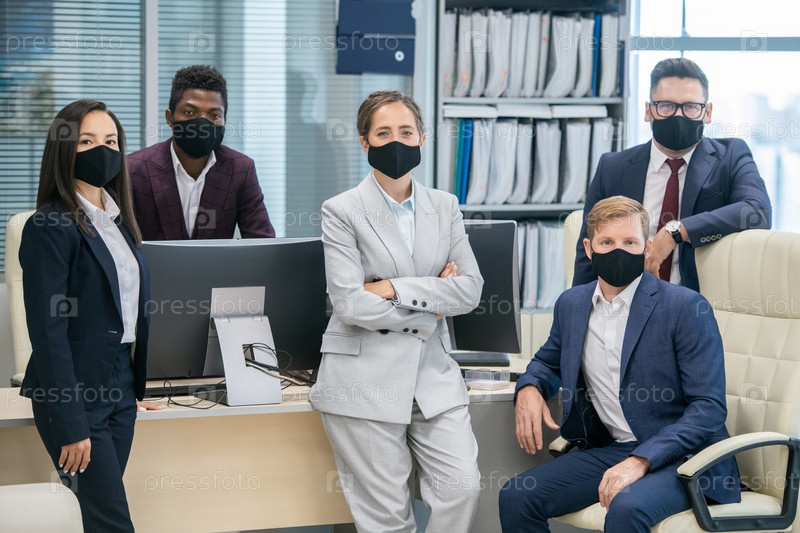 Пять межкультурных офис-менеджеров в защитных масках