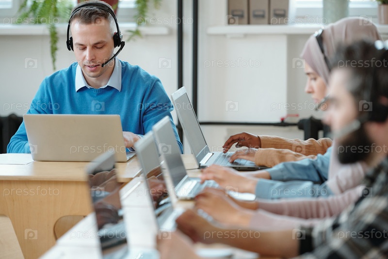 Серьезный бизнесмен консультирует онлайн-клиентов в рабочей среде
