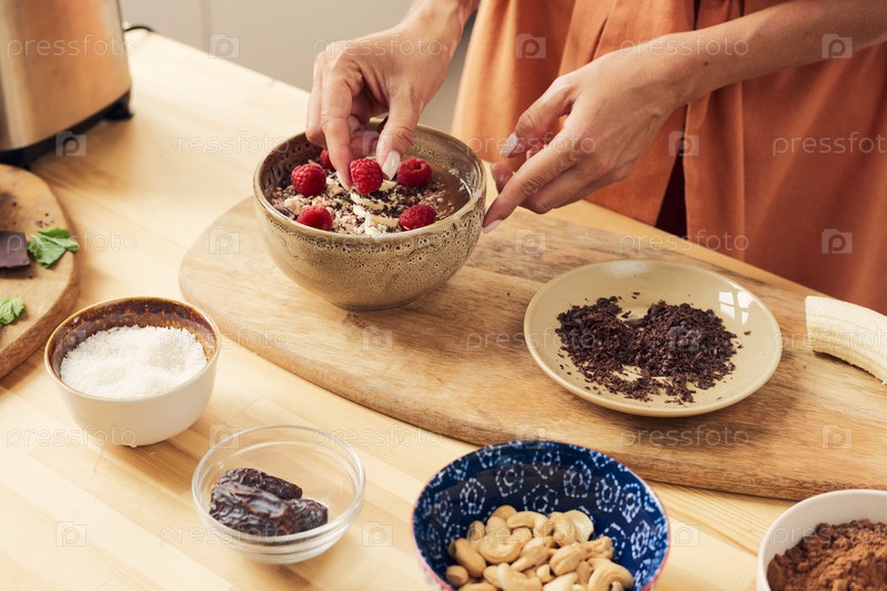 Рука самки кладет свежие спелые малины наверху смузи