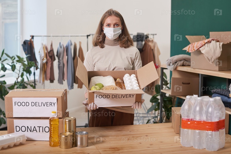 Женщина с коробкой пожертвований на еду