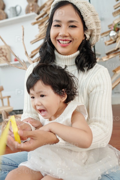 Мама и дочь играют с рождественскими украшениями