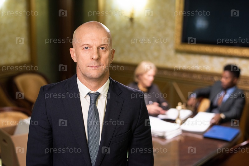 Зрелый лысый адвокат или глава юридической компании, стоящий перед камерой