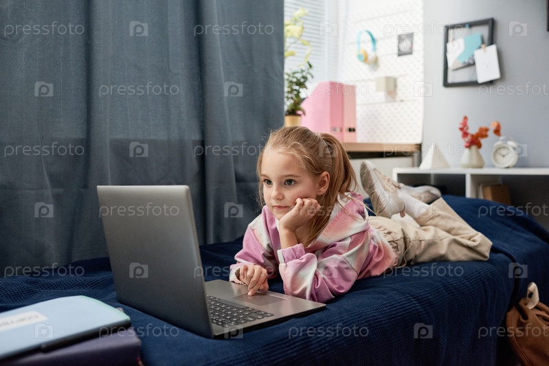 Серьезная красивая начальная девочка в повседневной одежде, лежащая на кровати и пользующаяся интернетом на ноутбуке