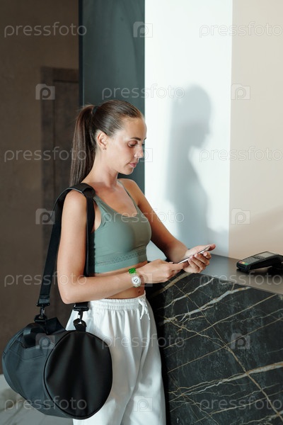 Брюнетка в спортивной одежде смотрит на экран смартфона, стоя у стойки при приеме
