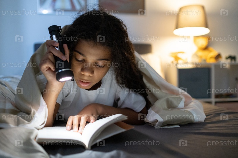 Концентрированная девушка наслаждается чтением по ночам