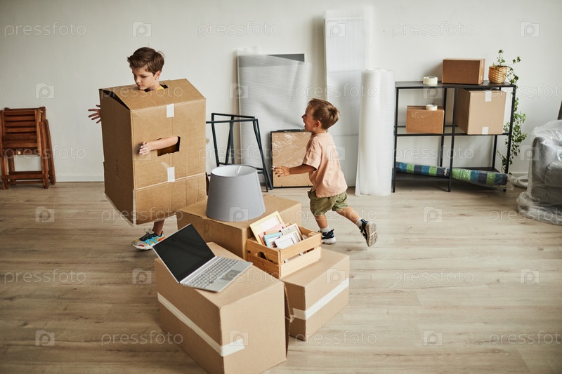 Братья играют в костюме из картонной коробки
