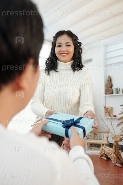 Женщина дарит мужчине рождественский подарок