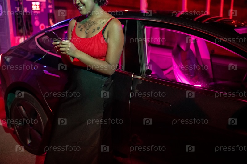 Улыбающаяся африканская женщина отправляет сообщения на смартфон, пока ее автомобиль заряжается