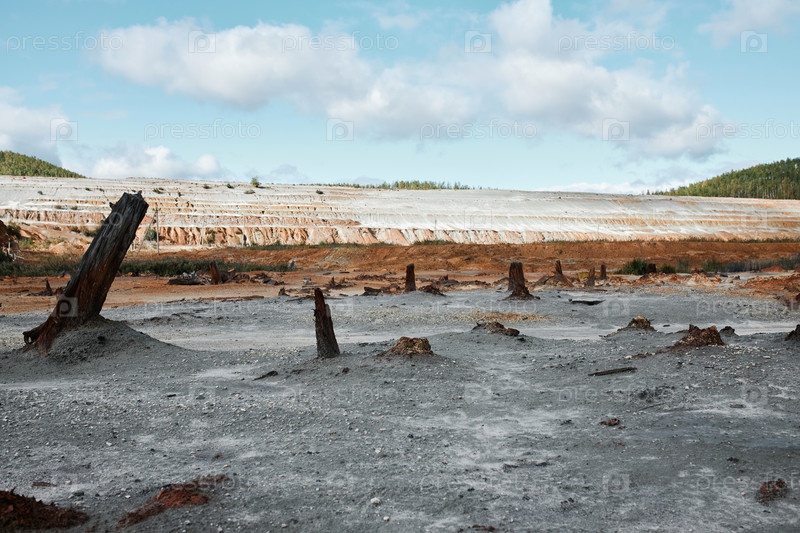 Заброшенная загрязненная территория с мертвыми сожженными стеблями на серой песчаной земле