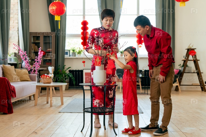 Семья из трех человек готовится к китайскому Новому году