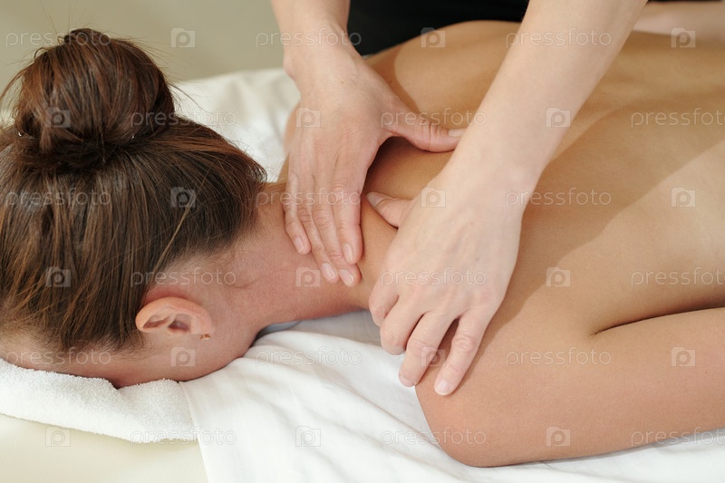 Руки массажистки касаются плеча молодой женщины во время процедуры красоты