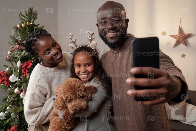 Счастливые родители и их милая дочь с домашним животным делают селфи