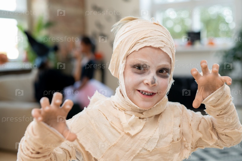 Улыбающийся мальчик в костюме мумии стоит перед камерой