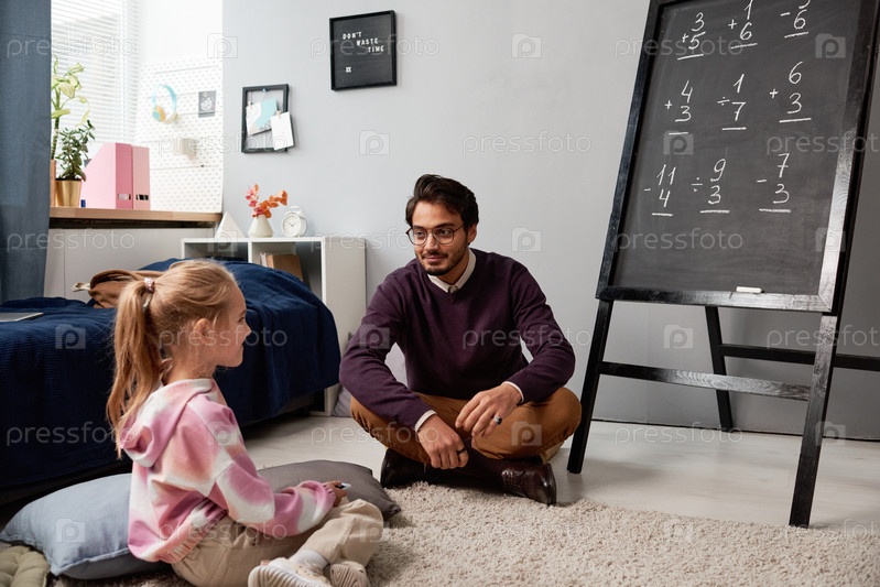 Молодой репетитор смешанной расы в очках сидит на полу возле доски и помогает девочке с математикой