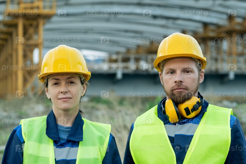 Инженеры в рабочих шлемах стоят на улице
