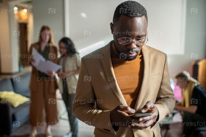 Серьезный африканский бизнесмен прокручивает в смартфоне
