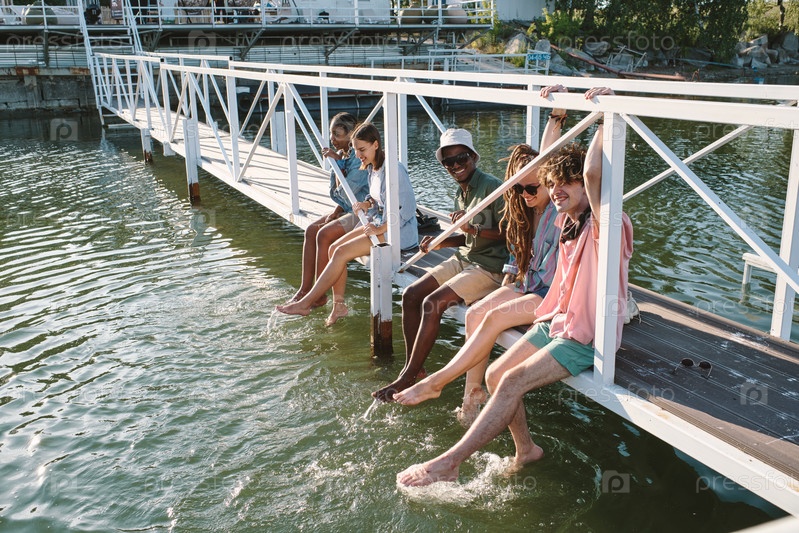 Группа молодых беззаботных друзей, расслабляющихся на мосту и брызгая водой