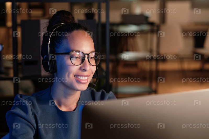 Улыбающийся привлекательный дружелюбный молодой специалист службы поддержки в гарнитуре с свободными руками отвечает на вопросы и проверяет информацию на компьютере