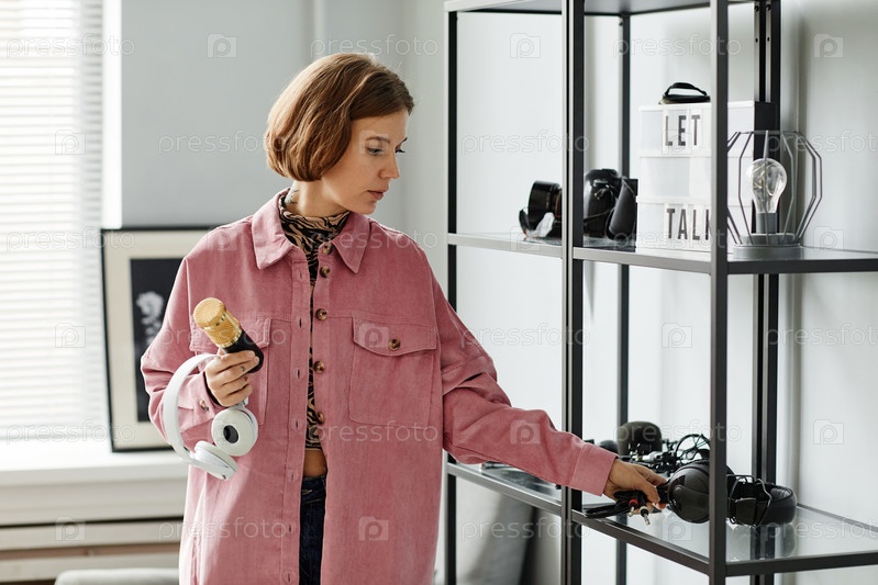 Молодая женщина устанавливает студию звукозаписи
