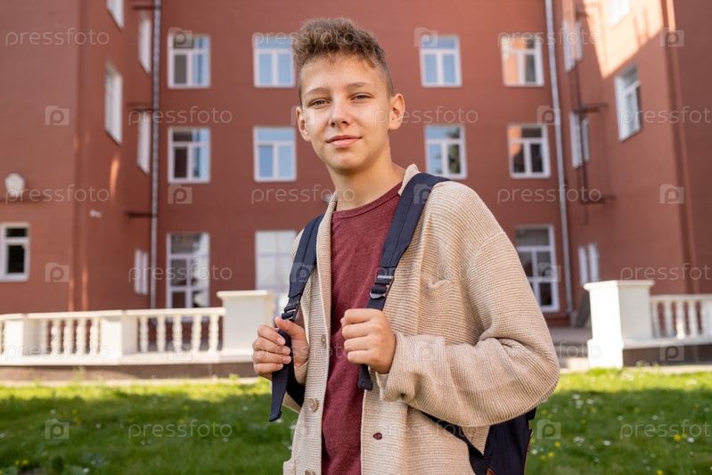 Счастливый школьник с рюкзаком стоит на зеленой лужайке против школы