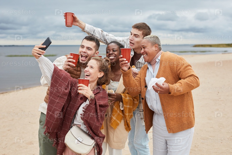 Молодые люди делают селфи на пляже