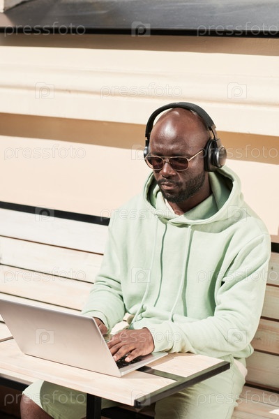 Афроамериканский мужчина в наушниках работает онлайн