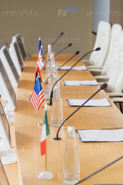 Ряд бутылок с водой, национальные флаги, микрофоны, компьютерные мониторы и бумаги