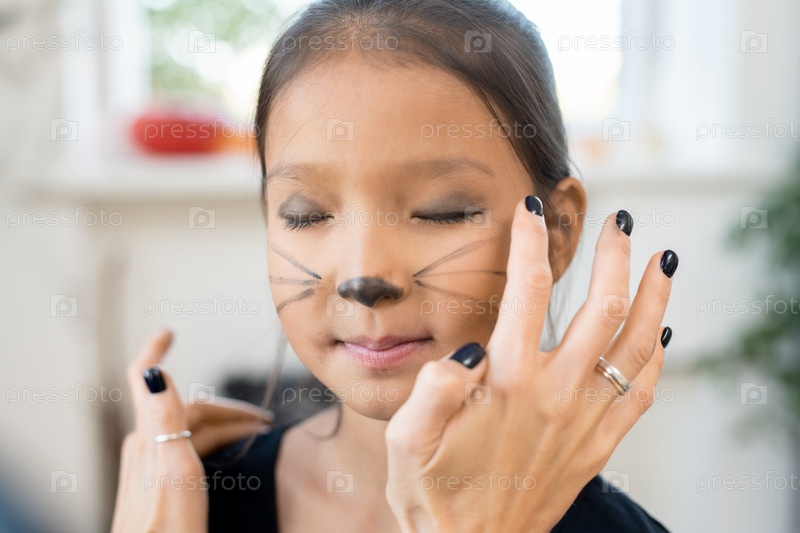 Маленькая девочка держит глаза закрытыми, в то время как женщина наносит тени для глаз на веки