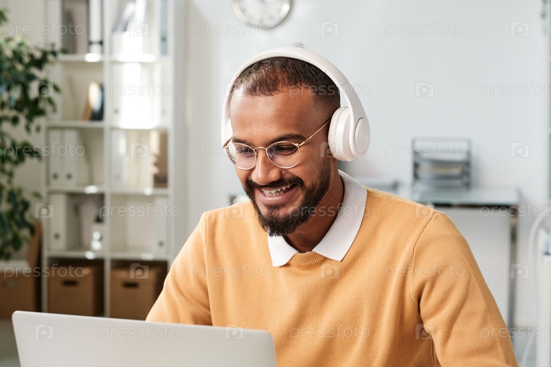 Веселый молодой ближневосточный менеджер в беспроводных наушниках смеется во время видеоконференцсвязи с бизнес-партнером через приложение для ноутбука