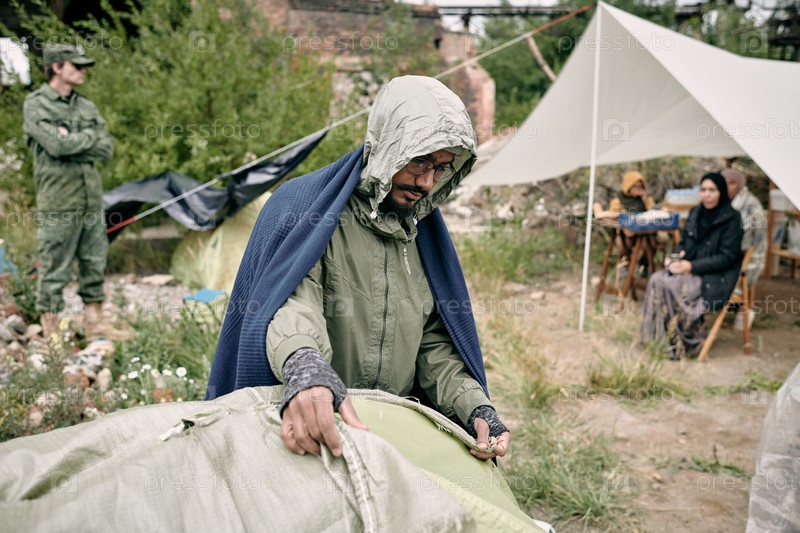 Человек-беженец покрывает палатку мешком