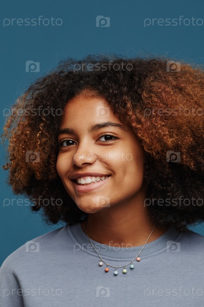 Улыбающаяся молодая женщина с натуральными кудрявыми волосами