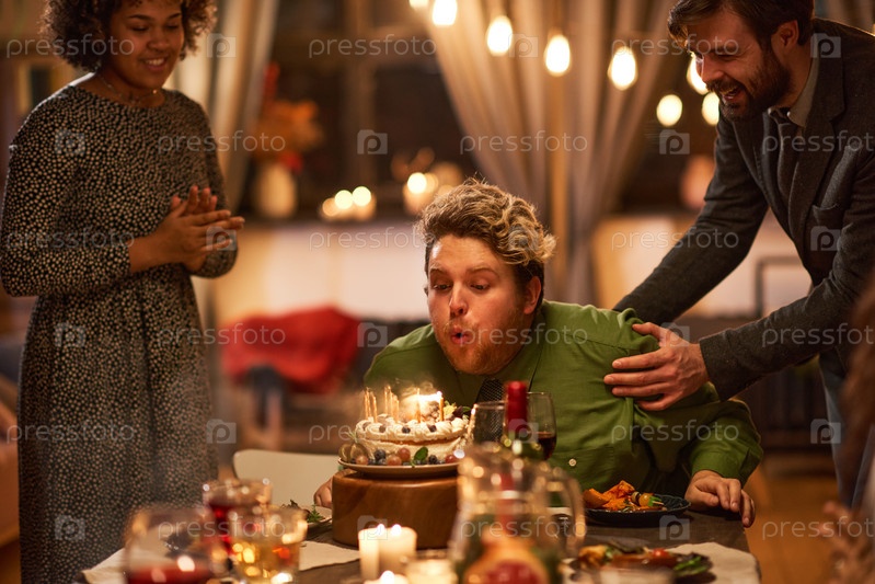 Мужчина дует в свечи на рождественском торте