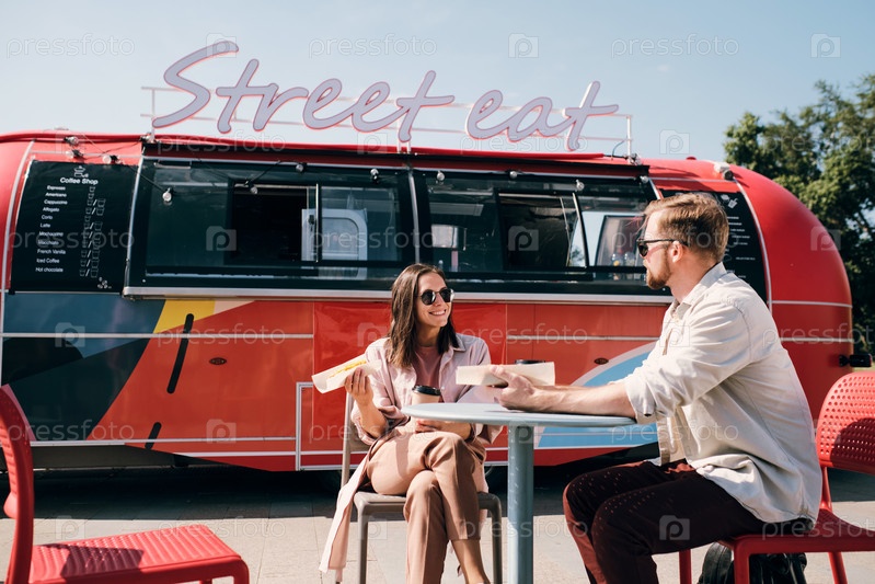 Молодая пара взаимодействует, когда ест фаст-фуд
