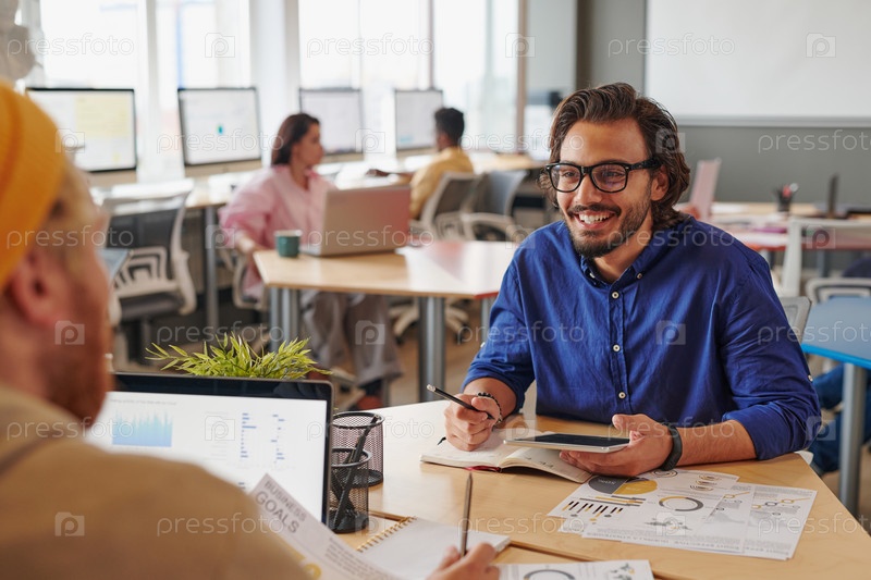 Молодые парни обсуждают проект в коворкинг-пространстве