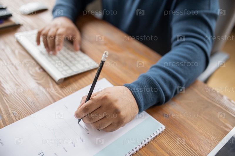 Рука учителя или экономиста с ручкой, указывающей на документ