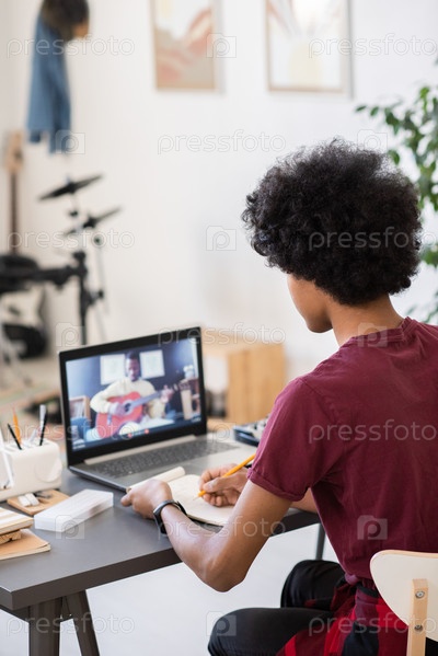 Бирациальный парень делает заметки, глядя на учителя музыки с гитарой